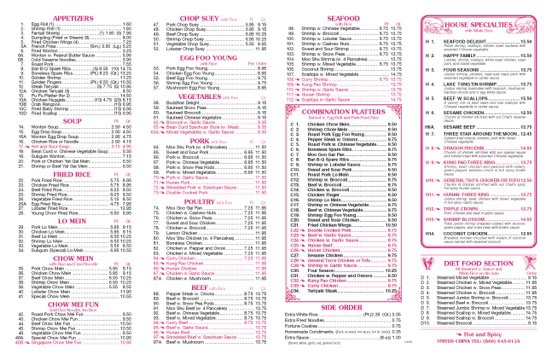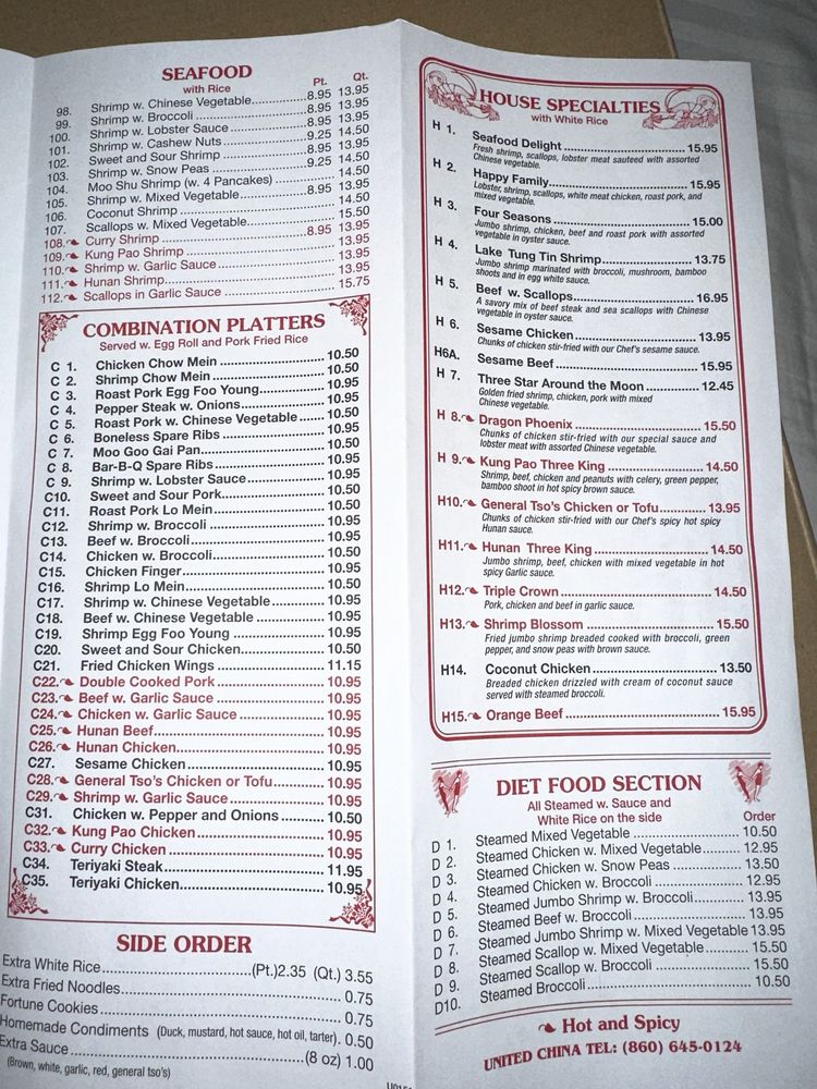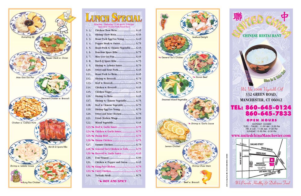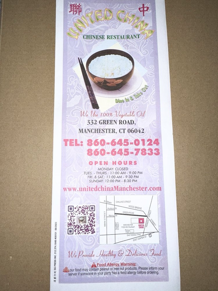 United China, located in Manchester, CT, is a Chinese cuisine gem offering a wide array of appetizers, chop suey, beef dishes, and more. With positive reviews praising their generous portions and delicious flavors, United China has become a go-to spot for Chinese takeout. Customers rave about the crispy fried chicken wings, flavorful crab Rangoon, and comforting Sweet and Sour Chicken. The consistent quality and variety make United China stand out as the best Chinese restaurant in the area. Don't miss out on their popular dishes like General Tso's chicken, beef with broccoli, and the mouth-watering boneless spare ribs. Whether you're dining in or taking out, United China is sure to satisfy your Chinese food cravings. Experience the best of Chinese cuisine at United China!